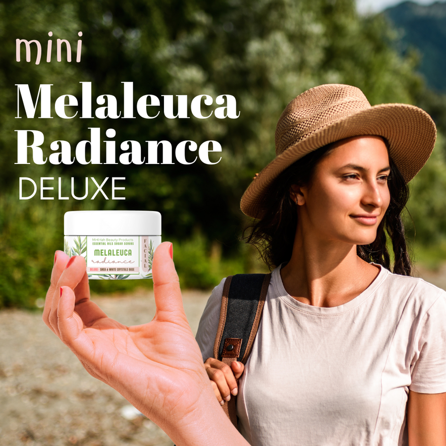 Our Melaleuca (Tea Tree) mini facial scrub offers a clarifying and purifying experience. Known for its antiseptic properties, melaleuca helps to cleanse the skin and combat blemishes. Melaleuca is a good travel companion as it can help maintain skin hygiene in different environments and address minor skin irritations that may arise during travel.